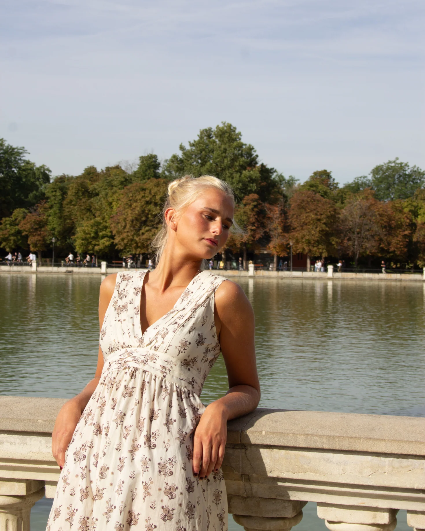 Camisón 100% algodón con estampado floral en color beige. Escote en V con detalles de plisado y tira bordada en pecho y cintura. Cierre trasero con botones. Perfecto para novias.