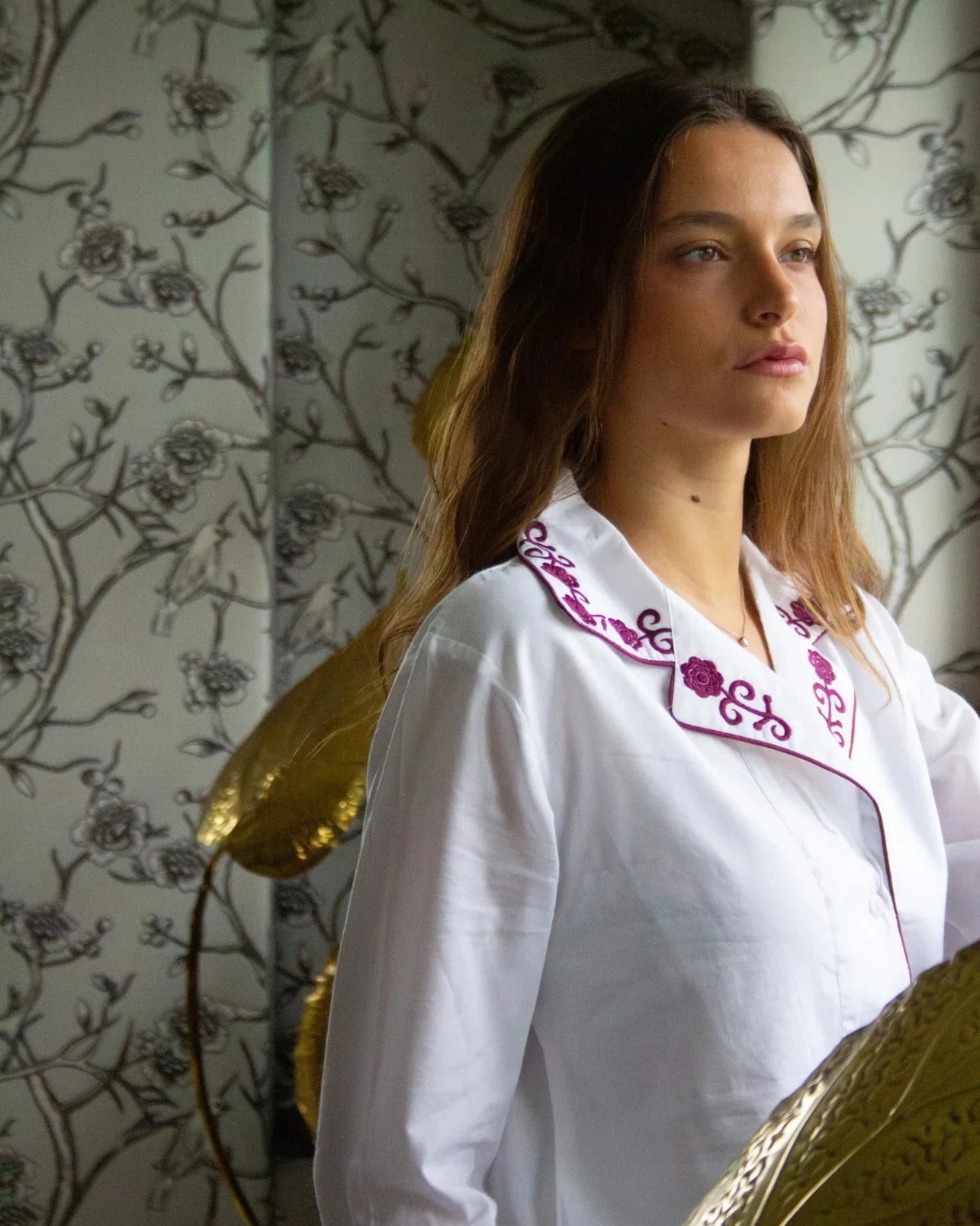 Pijama blanco con ribete en color berenjena y detalles de bordado en laterales, cuello y espalda. Camisa con cierre de botones y manga larga. Pantalón largo con cinturilla elástica.