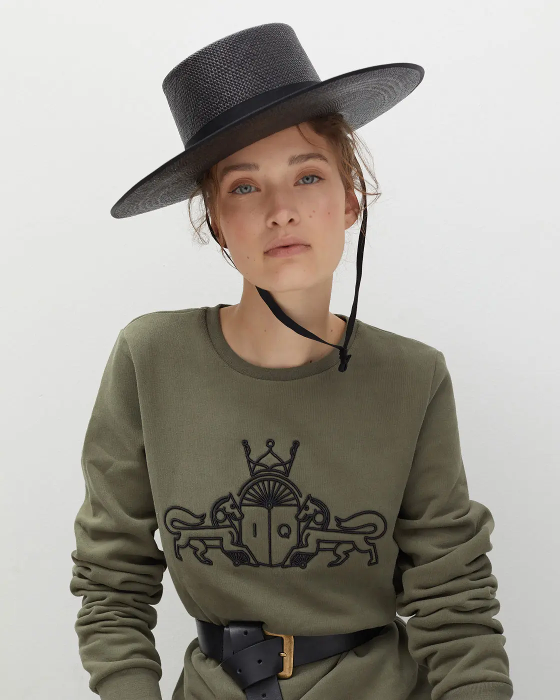 Sudadera JULIA color verde con logo de The IQ Collection bordado en color negro en la parte frontal.