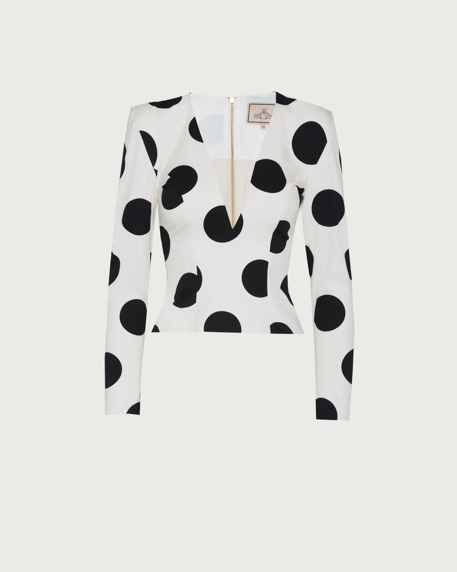 Top de manga larga con escote en pico con estampado de lunares blanco y negro. Cierre trasero con cremallera dorada.
